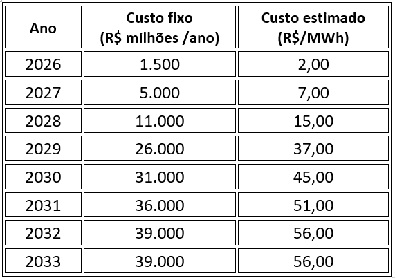 O custo fixo a ser suportado pelos consumidores tende a crescer de forma acelerada entre 2026 e 2032. Pelas estimativas, esse encargo parte de cerca de R$ 2,00/MWh em 2026 e, à medida que os empreendimentos contratados entram em operação conforme o cronograma previsto, alcança valores da ordem de R$ 56,00/MWh em 2032.